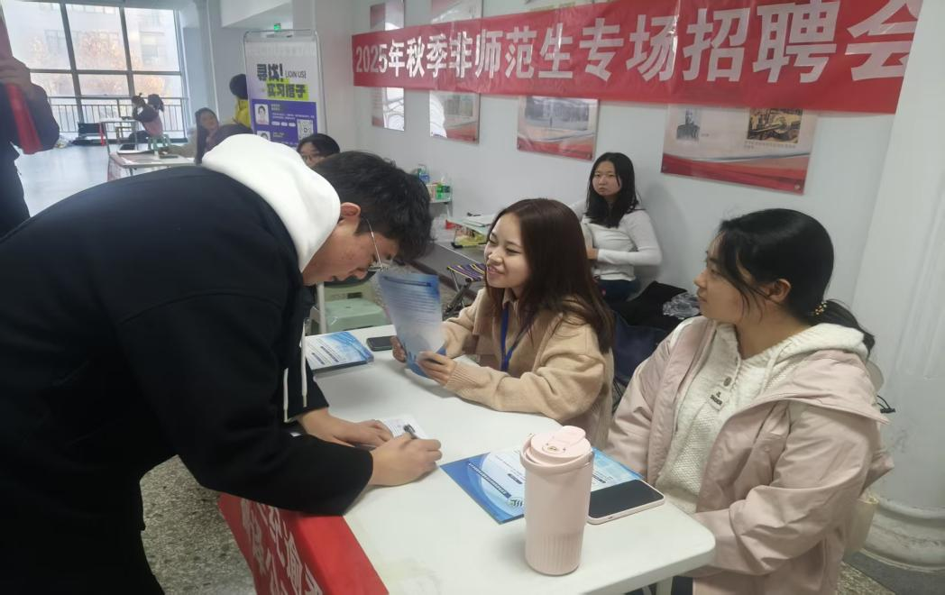 招聘会现场按“企业宣讲—简历投递—单独面试”流程有序推进,参会企业涵盖教育机构、翻译企业、企业管理服务等多个领域。