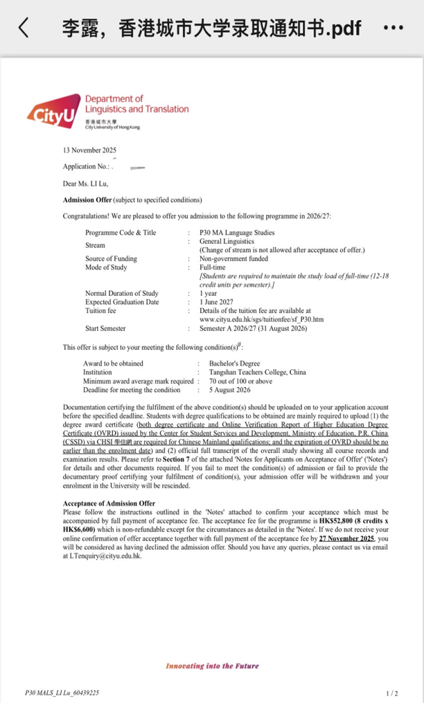 我校yl7703永利集团2022级英语专业学生李露成功获得香港城市大学的研究生录取通知书。该生成为学院2026届毕业生中首位成功申请至香港地区知名高校的学生,是其个人学业生涯的重要突破,也为学院国际化人才培养提供了有益案例。