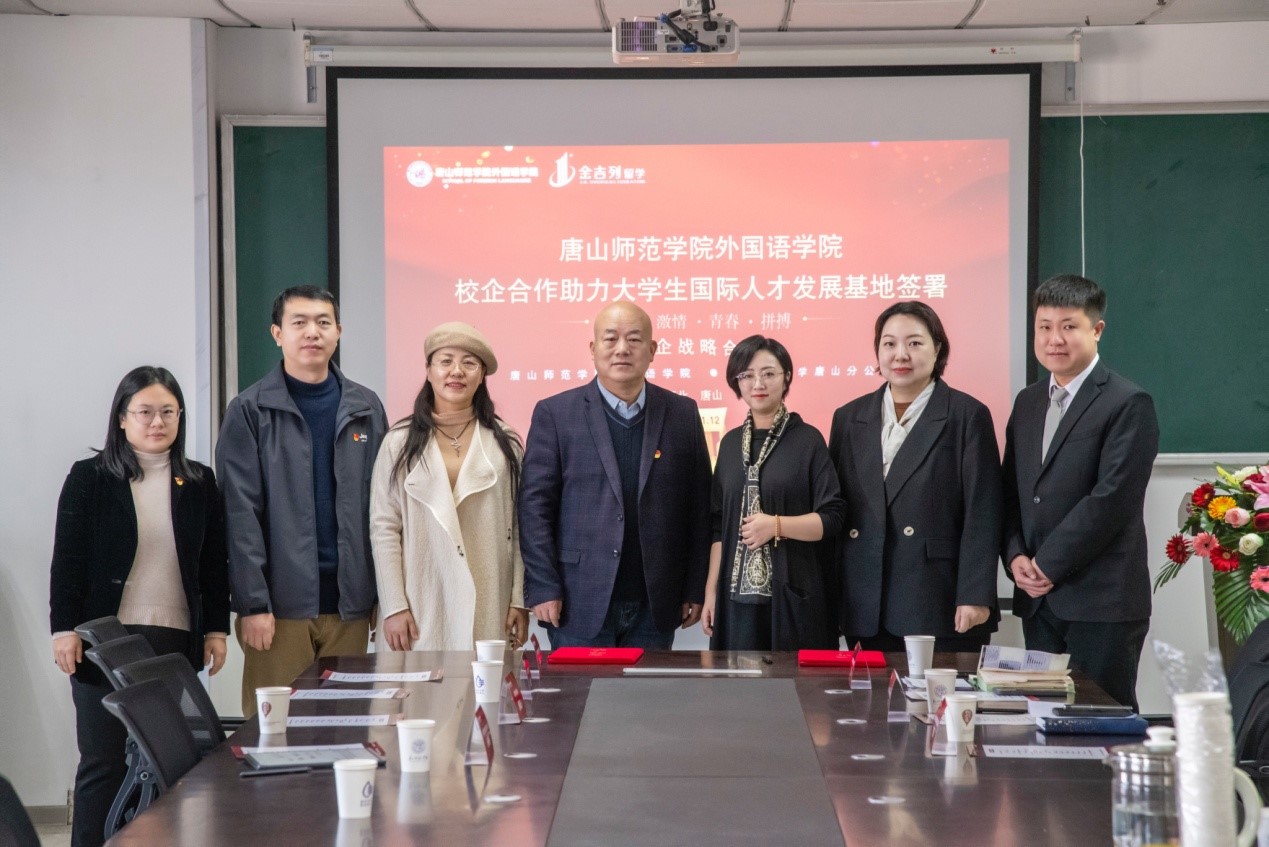 2024年1月12日上午,yl7703永利集团与唐山金吉列留学隆重举办了“创新创业国际人才培养基地”、“实践教学基地”、“就业基地”项目合作签约仪式。唐山金吉列留学总经理赵宁女士、项目经理张丽女士,我校yl7703永利集团党总支书记刘建宏、院长唐翠云、党总支副书记谷世海、招生就业办主任孙楠楠出席了本次签约仪式。