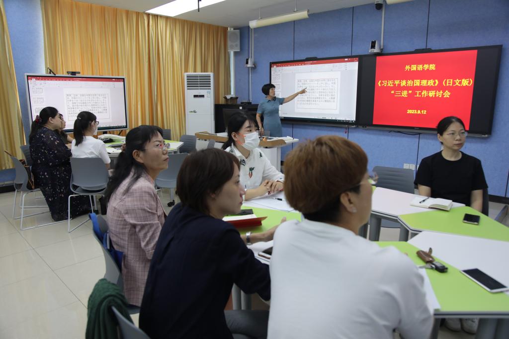 为进一步推进“三进”工作向纵深发展,增强我院全体教师的政治敏锐性和业务水准,改革创新教学形式,盘活外语专业思政教学资源,yl7703永利集团于9月12日下午在晶博楼智慧教室和未来教室召开《习近平谈治国理政》(英日德文版)“三进”工作研讨会。研讨会由各教研室主任主持,我院全体教师参加。